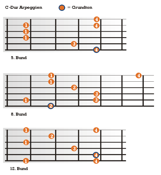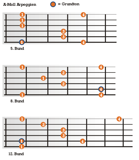 In ihrer ursprünglichen Form decken die Arpeggien alle Saiten ab. Kirk setzt in seinem Spiel zumeist auf Auszüge aus den Komplett-Griffbildern. Damit du aber auch die Komplettform kennenlernst und natürlich auch um das Ganze universeller einsetzbar zu machen, haben wir dir jetzt noch eine Übersicht der gebräuchlichsten Dur- und Moll-Arpeggien anzubieten. Lerne sie auswendig und versuche doch auch selber mal, die Akkordfolgen deiner Songs mit diesen netten Muntermachern aufzupeppen!