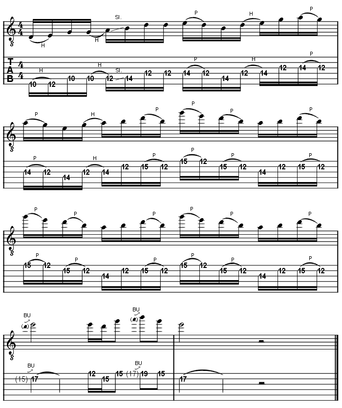 How To Play Like Metallica Seite 5So, legen wir also noch ein Schüppchen drauf und kommen zu Kirks Lieblingthema: Der Pentatonic Scale!!! In dem Teaser zu diesem Workshop hattest du ja schon Gelegenheit dazu, dich mit dem Thema ein wenig vertrauter zu machen. Jetzt ist es an der Zeit dieses Hauptbetätigungsfeld Kirks ein wenig intensiver zu beackern. Den Anfang machen wir mit einem ziemlich coolen Lick, der ausschließlich aus Tönen der E-Moll Pentatonic besteht. Mr. Hammett verbindet in diesem Lauf zwei Positionen der beliebten Skala. Den Lagenwechsel managed er typischerweise mit einem Sliding (2.Sechzehntelgruppe des Licks). Der Lauf endet in einem relativ einfach zu spielenden Repeating Pattern.
