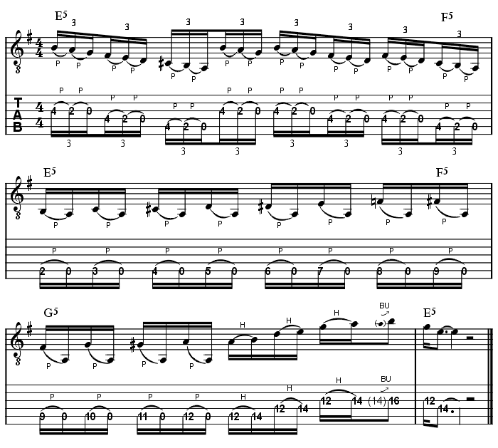 Der komplette erste Takt wird zwar ziemlich schnell gespielt, liegt aber dafür auch sehr gut in der Hand. Trotzdem rate ich dir zu Beginn deiner Testserie, zunächst einmal ein relativ gemäßigtes Tempo zu wählen. Nur so ist gewährleistet, dass du das Ganze am Ende deiner Trainingseinheit auch mit der nötigen Präzision zum Besten geben kannst. Gehen wir kurz mal ins Detail. Kirk wählt im ersten Takt eine sehr gleichmäßige Skalenstruktur. Das tonale Ausgangsmaterial entstammt, einmal mehr, der überaus beliebten E Moll Pentatonic. Aber schau dir das mal an: E-Moll Pentatonic + Leer Saiten E Dorische Skala Die Symetrie des Licks resultiert aud der Tatsache, dass sich Kirk hier einige zusätzliche Töne aus der E-Dorischen Tonleiter ausgeborgt hat: Namentlich wären das die Noten F# (gr.9/ 4 Bd. D-Saite) und C# (4 Bd. A-Saite), die gr.13. Diese Zusatztöne versorgen unseren Open Sting Lick mit der nötigen Farbe und sind die Erklärung für die eben schon beschriebene Symetrie! Kommen wir so zum zweiten Takt. Auch hier dominiert der Einsatz einer leeren Saite (A-String). Kirk spielt eine chromatische Linie die auf dem B (2 Bd/A-Saite) beginnt und sich kontinuierlich bis zum Oktav-A (12.Bd/A-Saite) hocharbeitet. Das Besondere daran ist, dass er die einzelnen Töne dieser Linie, jeweils mit einem Pull Off auf die leere A-Saite abwechselt. Eine Aktion, die dem Ganzen einen ziemlich abgefahrenen Sound gibt. Im letzten Takt wird wieder alles normal: Mit dem Gebrauch der puren E-Moll Pentatonic kehrt Mr. Hammett an den heimischen Herd zurück. Ist doch wunderbar!