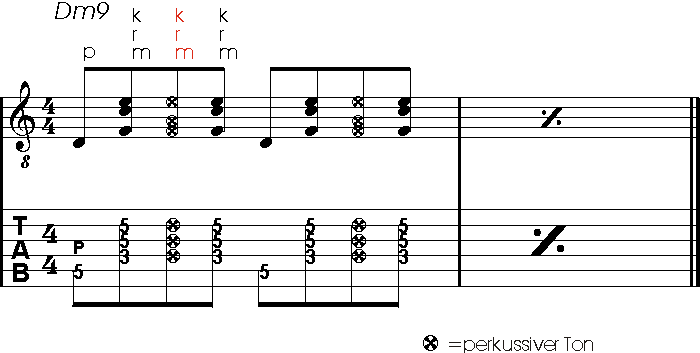 Der verwendete Akkord hört auf den Namen Dm9ÜBRIGENS: Die Abkürzung "P" im Notentext steht in diesem speziellen Fall nicht für das Wort Pollex (Daumen). Falls du dir das Video bereits angeschaut hast wirst du wissen, dass Roland sein Plektrum benutzt, um die Bass-Saiten zu betätigen. Das "P" fungiert in diesem Fall also als Stellvertreter des schönen deutschen Worts Plektrum. (m=Mittelfinger, r=Ringfinger, k=Kleiner Finger)Aber natürlich lässt sich das Pattern auch- konventionell- mit dem Daumen spielen. Der Basston kommt dann zwar nicht ganz so knackig rüber- aber es funktioniert trotzdem! Seine treibende Perkussivität erhält die Spieltechnik durch einen zweiten Trick. Roland "klopft" auf der "2" und der "4" mit seiner rechten Hand auf die Saiten und erzielt so einen sehr interessanten Groove-Effekt. Symbolisiert wird diese Aktion übrigens durch ein umkreistes x im Notentext. Basis-Pattern 1