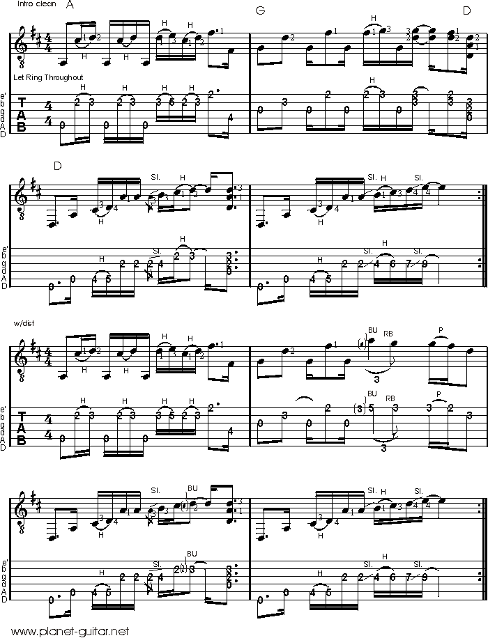 How To Play Like Creed's Mark Tremonti/New Edition Part II Seite 2Der zweite Song mit dem wir uns heute beschäftigen wollen, hört auf den Namen Stand Here With Me und zeigt eindrucksvoll, dass Mark in der Lage ist, seine Rhythmusgitarren-Kreationen so geschickt anzulegen, dass sie sowohl clean als auch verzerrt gespielt eine gute Figur machen. ÜBRIGENS: In Sachen Tuning setzt Mark in diesem Song auf eine Variante des Dropped-D Tunings. Zusätzlich zur standardmäßig auf "D" gestimmten tiefen E-Saite, tuned er hier auch die B- und hohe E-Saite um einen Ganzton tiefer. Das so entstandene DADGAD Tuning ist in der Folk- und Picking-Szene sehr gebräuchlich, aber auch Rocker Mark schätzt den "d-igen" Sound dieser Tuningvariante.