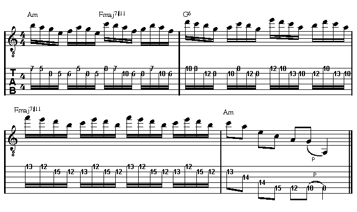 Technik: Da der Lick ausschließlich die "alternate picking"-Technik (Wechsel-Schlag ) verwendet ,eignet er sich ganz hervorragend dazu, die rechte Hand ein wenig auf Vordermann zu bringen. Rein aufbaumäßig besteht der Lauf ausschließlich aus einem einzigen Basispattern, das sich konsequent durch die verschiedenen Positionen der A-aeolischen Scale arbeitet.