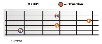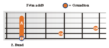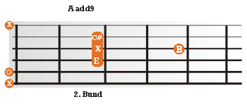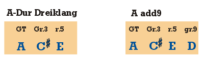Zurück zum Thema: Füge ich die grosse 9 jetzt einem ganz gewöhnlichen Dur-Akkord bei, so erhält dieser eine überaus interessante Klangfarbe. Doch nicht nur das. Auch sein Name erhält neuen Glanz. Ab jetzt darf sich der gemeine Dur-Akkorrd nämlich add 9 (oder added 9) nennen.