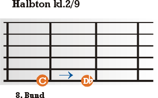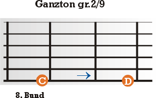 Der Abstand zwischen dem C und dem D entspricht also einem Ganzton, was diesen Tonabstand automatisch zur gr.Sekunde(2)/None(9) werden lässt. Im Gegensatz dazu bezeichnet man den Abstand von zwei Tönen, die Bund auf Bund folgen, als kleine Sekunde/None.