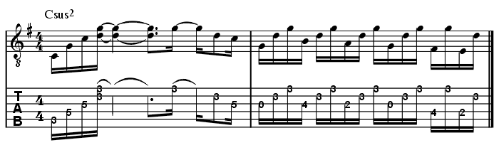 How To Play Like Henning Rümenapp/Guano Apes Seite 3Doch das ist noch nicht alles. Das nächste Beispiel kombiniert gleich zwei Konzepte miteinander. Der erste Takt gehört ganz einem C sus 2-Akkord (O Gott). Der zweiten Takt featured Hennings Vorliebe für wechselnde Bass-Töne. Erklärung folgt! Sus Muss! - Audio abspielen