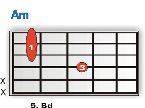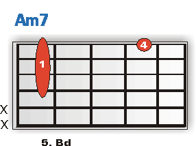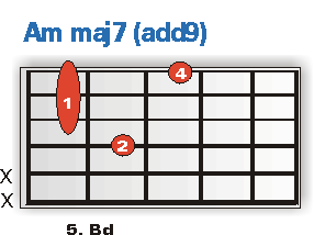 Die Basistonart der Nummer ist A Natürlich Moll. Den leicht melancholischen Touch verleiht Jimmy dem Song durch den Einsatz eines Moll maj7 Akkordes. Mit Hilfe der Maj7 (G#/6. Bd. G-Saite) verbindet Jimmy den Grundton des ersten Akkords (A/7. Bd. D-Saite) mit der kleinen Septime (G/5. Bd. D-Saite) des Am7 Chords und erzeugt so eine interessant klingende absteigende chromatische Linie. Parallel dazu bewegen sich die hohen Töne der ersten drei Akkorde konsequent nach oben, so dass sich eine angenehm klingende Gegenbewegung ergibt, die einen großen Teil der Wirkung des Intros ausmacht. Den Rest des Intros bestreitet Jimmy mit standardmäßigen offenene Akkordvoicings. Das wichtigste soundbildende Merkmal in diesem Teil der Nummer ist sicher der smooth klingende Fmaj7 Akkord. Noch was zum Thema Tonart: Nahezu alle Chords des Intros lassen sich- wie eben schon erwähnt- der Tonart A Natürlich Moll zuordnen. Die einzige Ausnahme in diesem Reigen bildet der D-Dur Akkord, den man als Zitat aus G-Dur ansehen kann! |