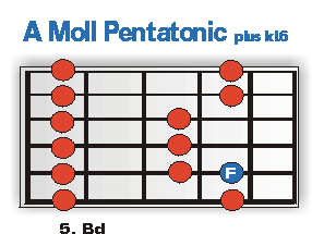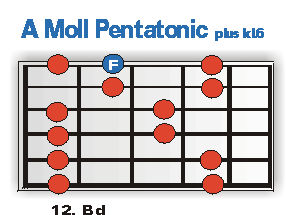 PG Classic Rock Workout Led Zeppelins Jimmy Page Teil 2 Seite 2So, packen wir es an. Wie eben schon erwähnt setzt Jimmy innerhalb seines Stairway To Heaven Solos in Sachen Tonmaterial nahezu ausschließlich auf den Sound der bewährten A-Moll Pentatonik Skala. "Nahezu ausschließlich" deswegen, weil Herr Page an einigen Stellen mit dem Einsatz des Tons "F", auf ein Zitat aus der A- Natürlich Moll Tonleiter zurückgreift- eine Maßnahme, die die Wirkung des F-maj7 Akkordes der Basis-Kadenz weiter verstärken soll. Konkret sind es zwei Positionen der gemeinen A-Moll Pentatonik, die Jimmy mit dem wohlklingenden "F" verziert.