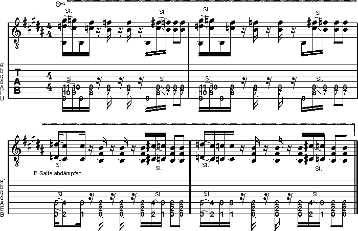 Auch Bands wie Metallica arbeiten in ihren Riffs mit dem verschärften Sound dieses Intervalls. Doch Korn setzen noch einen drauf und liefern sich im ersten Takt der Studie eine wahre b5 Schlacht, die sich rund um einen B b5 Powerchord ansiedelt. Die Takte 3 und 4 gehören dann wieder ganz dem auf der letzten Seite bereits vorgestellten Oktavspiel.