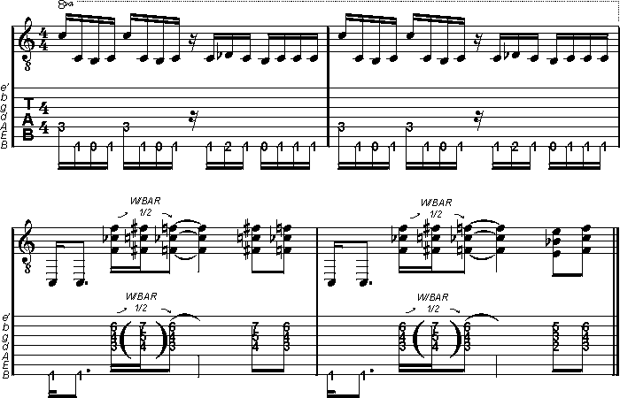 How To Play Like Korns Head and Munky Seite 3Head und Munky haben ein besonderes Interesse an Tremolosystemen. Das zeigt schon die Tatsache, dass die beiden beim Design ihrer Ibanez Signature Gitarren (K-7), besonderen Wert auf die Ausstattung des verwendeten Lo-Pro Edge 7 Tremolos gelegt haben. Der hier zum Einsatz kommende, sogenannte U-Bar (eine Art Bügel), eignet sich auf das Hervorragendste zum Erzeugen von Vibrato-Slides, einer Whammy-Bar Technik mit der die beiden Recken ihre Riffs in schöner Regelmäßigkeit mit dem besonderen Kick versorgen. Hör dir schnell mal das nächste Beispiel an und dann gibt es die nötigen Detailinfos. Whammy XT hören