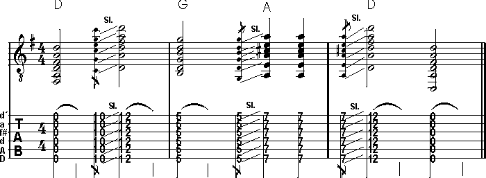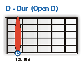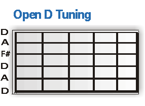 TIPP: Alle in ihrer Stimmung veränderten Saiten, werden Heruntergetuned. Die beiden E-Saiten um einen Ganzton (auf D), die G-Saite um einen Halbton auf F# und die B-String um einen Ganzton auf A. Beim Anschlagen der Leer-Saiten einer Gitarre die mit einer offen D Stimmung ausgestattet ist, erklingt ein lupenreiner D-Dur Akkord. Aus dieser Tatsache ergibt sich, dass auch ein purer Barre´Griff ab sofort im reinsten Dur erklingt. Für unser Vorhaben am Ende des Workshops einen authentischen Slide Blues realisieren zu können, ist das natürlich sehr angenehm. Schließlich brauchen wir jetzt nichts weiter zu tun, als die Saiten an den entsprechenden Stellen komplett mit einem "breiten" Finger (oder dem Slide-Röhrchen) abzudrücken. Wo genau, zeigt dir die folgende Abbildung: