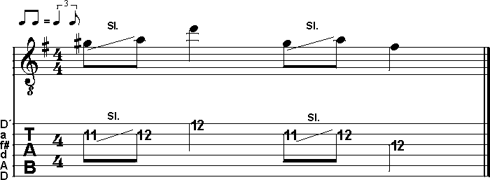 Beide Pattern folgen dem selben Spiel-Prinzip. Der typische Slide-Sound entsteht durch eine chromatische Umspielung des Zieltons. Als Startton wählte Matt hier jeweils eine um einen Halbton unterhalb des Ziels angesiedelte Note. Im Falle unseres ersten L-Shapes wäre der Startton also ein F (11. Bund G-Saite). Als Zielton kommt das F# im 12. Bund G-Saite zum Einsatz. Beispiel 2 erhält seinen smoothen Sound durch die chromatische Annäherung an den gewünschten Zieltons A (12. Bund B-Saite) aus Richtung 11. Bund (G#). Cool ist, dass sich dieses Spielprinzip, durch die offene Stimmung der Gitarre, problemlos auch auf alle anderen Saitengruppen übertragen lässt.