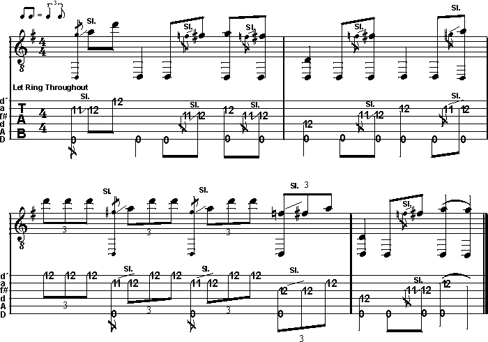 Das komplette Beispiel basiert auf dem Sound des D-Dur Akkordes, der- wie du ja schon weißt- im 12. Bund einer mit einem offenen D-Tunings ausgestatteten Gitarre zu finden ist. Das Beispiel wird im traditionellen Fingerstyle gespielt. Dabei übernimmt der Daumen der Zupfhand die Bassbedienung. Zeige-, Mittel-, und Ring-Finger sind jeweils für die G-, B-, und E-Saite zuständig. Da der Sound der tiefen E-Saite einen maßgeblichen Anteil an der Verfettung des Gesamtklangbilds hat, solltest du beim Üben des Blues-Pattern besonders darauf achten, dass du dein Slide-Röhrchen nicht zu hoch ansetzt (siehe Video). Nur so ist gewährleistet, dass die Saite - ohne eventuelle Behinderung durch das Röhrchen- tief und breit aufschwingen kann. Nutze auf jeden Fall auch das Slo Mo Audio. Es kann dir dabei helfen, den Gesamtzusammenhang des Beispiels zu erfassen. Überhaupt kann ich dir (wie so oft) nur empfehlen, die Übung zu Beginn deiner Studien sehr, sehr langsam zu spielen. Denn du weißt ja: Nur so ist gewährleistet, dass du keine ungewollten Fehler einbaust und das Pattern mit der nötigen Präzision und Sauberkeit zum Besten geben kannst!
