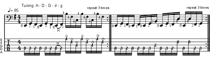 kommt, sieht folgendermaßen aus Für das zweite Beispiel habe ich eine weitere 5-Saiter Tuning Variante verwendet: A-D-G-d-g Die oberen zwei Saiten entsprechen dabei dem Standard-Tuning, die unteren drei Saiten werden allesamt um einen Ganzton tiefer gestimmt. Du wirst feststellen, dass sich der Bass-Sound durch diese Maßnahme drastisch verändert. Speziell in Verbindung mit frischen Saiten entsteht so eine gute Mischung aus Low-End und Präsenzen. Als Nebenwirkung der Aktion lassen sich die Saiten hervorragend ziehen und motivieren so zu neuen Spielexperimenten .