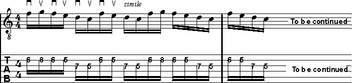 Die erste Übung, mit der uns John während unseres Gesprächs beglückt hat, steht ganz im Zeichen des Alternate Picking, der Wechselschlagtechnik. Wie ihr ja sicher wisst, ist John eine echte Maschine im Umgang mit dem Plektrum. Um eine stabile Position seiner Picking Hand zu gewährleisten, legt Mr. P den Ballen seiner Picking Hand auf der Bridge ab und rutscht -je nachdem welche Saite er gerade bearbeiten will- mit der Hand auf dieser "Führungsschiene" rauf und runter.