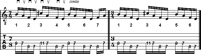 Das Mitzählen ist beim Üben von vertrackten Rhythmen und Linien absolut lebenswichtig. Versuche also bitte von vornherein darauf zu achten, nicht einfach nur so drauflos zu spielen, sondern immer den Beat im Auge zu behalten. ÜBRIGENS: Unter dem Logo Odd Time firmieren im allgemeinen alle ungeraden Taktarten. Dementsprechend ist ein 5/4 Takt genauso ein Odd Time Groove, wie der im Progressiv Rock Business sehr beliebte 7/8 Takt. Weitere Picking Tipps findest du auf der