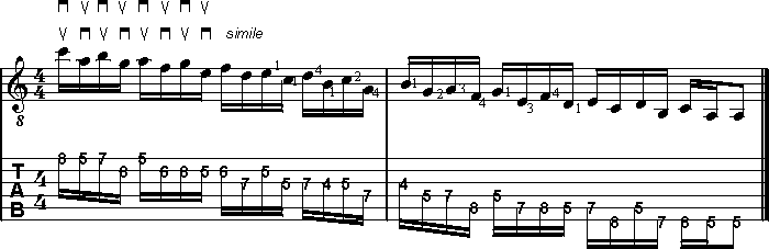 Beide Studien hören auf den Namen "Sequenz Lick". Unter den Sammelbegriff Sequenzen fallen im allgemeinen all jene Licks, deren Basis von einer logischen Tonabfolge gebildet wird. In unserem ersten Beispiel besteht die logische Basis aus einer jeweils vier Töne umfassenden Folge. Dabei startet man mit dem höchsten Ton der Leiter und spielt von ihm aus vier Noten "bergab" (C B A G). Ist das erledigt springt man zurück zum zweithöchsten Ton (B) und verwendeten ihn als Start-Ton für eine weitere, vier Noten umfassenden, Linie (B A G F) etc. Unter Fachchinesen ist diese Sequenz übrigens unter der Bezeichnung Vierergruppen bekannt. Ist ja irgendwie auch logisch! Das Grundgerüst der zweiten Studie wird aus sogenannten diatonischen Terzen gebildet. Bildlich gesprochen überspringt man beim Spielen einer Tonleiter in diesem Stil, jeden zweiten Ton. In unserem konkreten Beispiel starten wir mit dem hohen C (8. Bund/E-Saite), überspringen das B (7. Bund/E-Saite) und spielen das A (5. Bund/E-Saite). Danach starten wir mit dem B (7. Bund/E-Saite), überspringen das A und spielen das G (8. Bund/B-Saite) usw.... Um das Ganze etwas appetitlicher anzurichten, haben wir dir die hier verwendete Tonleiter (A natürlich Moll) als übersichtliches Griffbild anzubieten. Guten Appetit!
