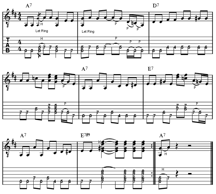| von Hansi Tietgen Während eines ausführlichen Interviews mit Kenny konnte ich es mir nicht verkneifen, ihm einen seiner ziemlich coolen Blues-Riffs abzuschwatzen. Das Teil steht in A und basiert auf einer Standard-Blues Kadenz (I-IV-V/ A-D-E). Kenny mischt Riffs mit Double-Stops und Akkordzitaten zu einem hochexplosiven Cocktail, der einfach nur Spass macht. Koste doch mal!