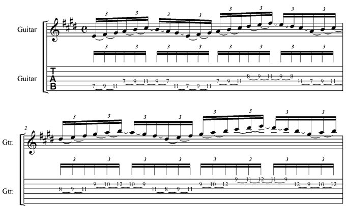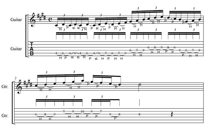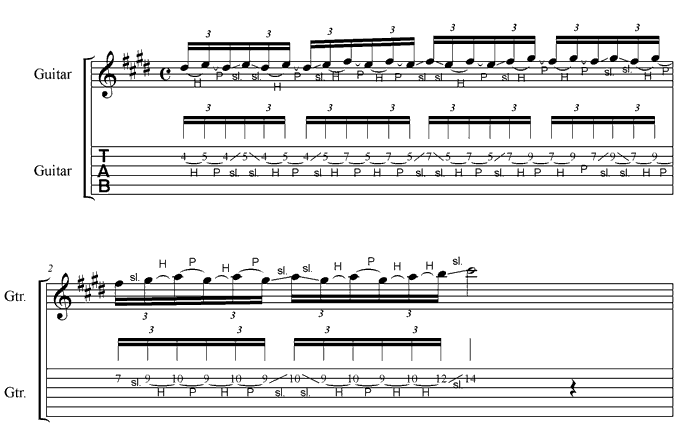 Kommen wir zum Pattern. Das Lick lebt vom massiven Einsatz von Slidings. Das klingt cool, macht die Sache spieltechnisch aber nicht unbedingt leichter: Gerade wenn man, wie hier, "in time" zwei Slides unmittelbar hintereinander abfackeln muss. Bevor du jetzt anfängst überstürzt an die Arbeit zu gehen, solltest du die Struktur und den Ablauf des Pattern erst einmal intensiv in Augenschein nehmen. Und, fällt dir was auf?! Genau, die Basis des Pattern ist symmetrisch und wiederholt sich alle neuen Töne. Der Startpunkt des Basis-Licks liegt dementsprechend abwechselnd auf einer Zähl-, und einer "Und-Zeit". Das ist keine Schikane, sondern eine Maßnahme die dem Lick einen undurchschaubaren, komplexen Sound verleiht. Spiele das Basispattern (die ersten neuen Töne) zunächst sehr, sehr langsam - solange bis dir die Struktur und das zugrunde liegende Spielprinzip in Fleisch und Blut übergegangen ist. Danach kannst du damit anfangen die Lagenwechsel einzubauen und das Ganze mit Hilfe deines Metronoms (wie, du hast keins? Jetzt aber los :o)) auf rhythmisch sichere Beine zu stellen - immer noch im gemäßigten Tempo, versteht sich! Das Üben des Licks wird auch bei gut trainierten Gitarristen einige Zeit in Anspruch nehmen - der coole Sound des Lix und die Möglichkeit die Lagen einer Tonleiter "smooth" miteinander zu verbinde, werden für diesen Aufwand aber tausendfach entschädigen- garantiert ! Kommen wir zum zweiten Legato-Lick. Auch hier kommt Andys Signature Legato-Lauf zum Einsatz. Allerdings nur im ersten Teil des Licks. Schau selbst! Andys Legatomagic 2 hören