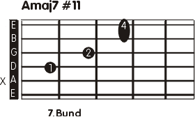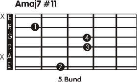 Das oben abgebildete Basislick arbeitet in der A lydischen Skala, einer Kirchentonleiter (oder Mode) die auf der IV. Stufe der "normalen" E-Dur Tonleiter zu finden ist und wegen ihres offenen, atmosphärischen Sounds auch von Gitarristen wie Joe Satriani, Steve Vai oder Pat Metheney sehr gerne "genommen" wird. Das vorliegende Pattern verbindet gleich mehrere Lagen der flotten Scale miteinander. Um das ganze standesgemäß zu unterlegen habe ich einen Backing-Track eingespielt, der mit einem typischen lydischen Akkord arbeitet: dem A maj7 #11. Hier einige Vertreter der Atmo-Abteilung: