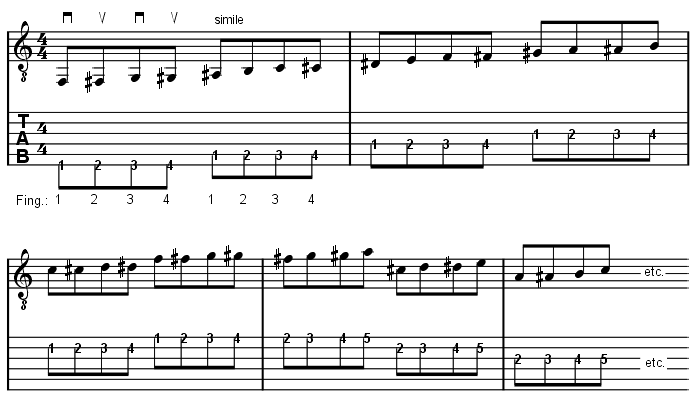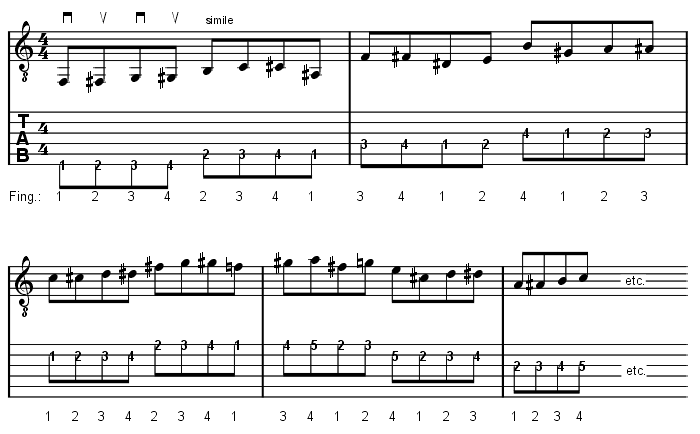 How To Play Like Steve Vai Seite 2Steve ist nicht nur ein überaus begabter Song-Writer sondern auch ein Saitenakrobat par exellence. Grund genug ihn während unseres Gesprächs um einige Technik_Übungen aus seiner berufenen Feder zu bitten. !SV: Wie wäre es mit ein paar netten Warm-Up/Koordinations-Trainingseinheiten?! Die erste Figur ist ebenso effektiv wie berühmt. Hier spiele ich linear und auf jeder Saite identisch vier Töne chromatisch nach oben, wechsle dann in die nächsthöhere Lage und spiele dasselbe Pattern wieder herab. Figur 2 greift genau dieses Thema auf und variiert es in der Form, dass jeder der vier Finger/Notes einmal der Startton der Linie wird (1-2-3-4/2-3-4-1/3-4-1-2/4-1-2-3-etc.).