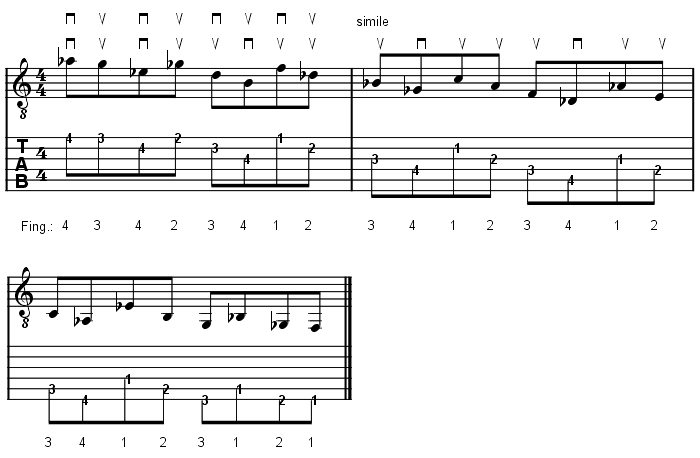 In Figur 3 breche ich schließlich mit dem linearen Spiel und wir trainieren das Saitenwechseln so, wie es uns im Arpeggiospiel immer wieder begegnet. Pickingtechnisch habe ich euch zwei Variationen dazunotiert. Eine für Wechselschlagpuristen und eine zweite mit typischem Economic-Picking. Lass dir auch hierbei sehr viel Zeit und steigere das Tempo sehr langsam. Wenn man einmal richtig schnell und trotzdem sauber spielen möchte, ist das der Tipp überhaupt. Sobald man während des Spiels auch nur den kleinsten Fehler macht, sollte man die Übung von neuem beginnen, nur eben noch LAAANGSAAAAMER! Dann kann wirklich nichts mehr schiefgehen.