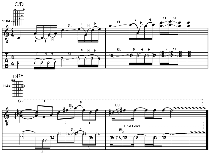 How To Play Like Steve Vai Seite 3Viele Vai-Songs schöpfen ihre mystische Energie aus dem Gebrauch sehr unterschiedlicher Skalentypen. Das gilt sowohl für Melodielinien als auch für seine atemberaubenden Soli. Lies am Besten selber, wie Steve sich zu diesem Thema geäussert hat! !PG:Die meisten deiner Songs sind aber nicht nur spieltechnisch, sondern gerade auch harmonisch ziemlich heftig. Wie entwickelst du die Imrovisationen über harmonisch komplexen Akkordstrukturen? (z.B. For The Love Of God unter anderem zu Hören auf Steve Best Of CD The 7th Song) !SV: Auf dem College habe ich mich intensiv mit dem Spiel über modulierende Changes (Akkordfolgen mit Tonartwechseln) beschäftigt. Später gab es dann aber kaum die Möglichkeit für mich, diesen Kram auch einzusetzen. Als Gitarrist von Whitesnake oder David Lee Roth waren andere Sachen gefragt. Hier ging es mehr um echtes Rock-Shredding.! Bei meiner eigenen Musik sah das aber schon ganz anders aus. Nimm zum Beispiel das Solo zu OOOO von Song The Ultrazone. Der Soloteil ist, gerade wegen der Modulationen, ziemlich hart zu spielen. Wenn es daran geht, die Lead Parts zu Songs dieser Art auszuchecken, versuche ich mich mehr von meinem Ohr leiten zu lassen als von dem theoretischen Stuff, den ich irgendwann einmal gelernt habe. Die Art und Weise, wie ich das Ganze austüfftle, ist hierbei eigentlich immer dieselbe: Zuerst lege ich mir in verlangsamter Form eine Loop mit den ersten Akkoden eines zukünftigen Solo-Teils. Danach versuche ich, frei von jedem fingersatztechnischen Gedanken die Skalen zu entdecken, die meiner Meinung nach am besten zur Stimmung des jeweiligen Akkordes passen. Analysieren kann man das Gespielte später ja immer noch wenn man will. Damit ihr das selbst mal ausprobieren könnt, gibt es einen Jam-Track und als kleine Zugabe eine für mich typische Linie über den Chords.