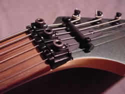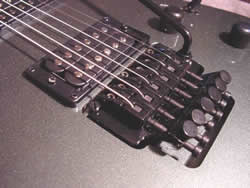 Freischwebendes Tremolo-System. Eine Unterfräsung ermöglicht es, das Tuning von Tönen und Chords sowohl nach oben als auch nach unten zu verändern.