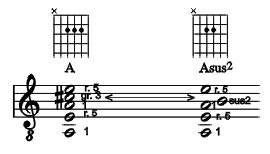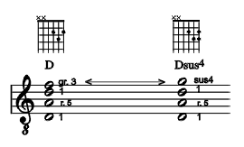 In unserem konkreten Beispiel "sus4" wird die Terz also durch eine reine Quarte (4) ersetzt. Der Fach-Chinese würde sagen: Die Quarte wird vor die Terz gehalten (Vorhalt). Erzeugt eine Suspendierung im menschlichen Leben eher Frustration und Depression kann sie, im Akkord-Business für erholsame Abwechslung sorgen. Hör dir doch mal an, wie schön ein D-Dur-Chord mit seinem Dsus4 Verwandten harmonisieren kann: Es gibt noch eine weiter Möglichkeit, diese "Technik" einzusetzen. Den sus2-Akkord. Hier ersetze ich die Terz durch eine große Sekunde (gr.2).