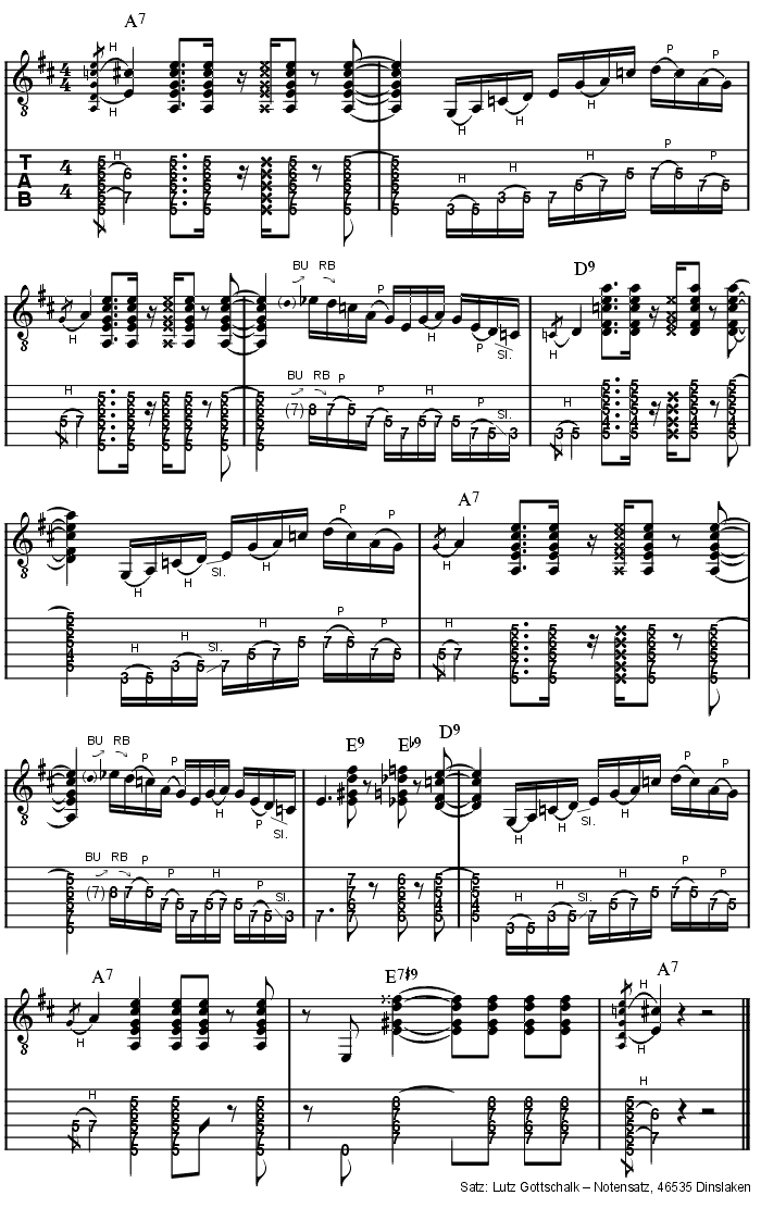 Neben den vier Akkorden, die wir dir ja bereits auf der letzten Seite vorgestellt haben, besteht der Blues aus zwei Basislix, die sich ausschließlich aus Tönen der A-Moll Pentatonik bzw. der A Blues Scale zusammensetzen. Sie repräsentieren den Soloaspekt von Stevies Blues und dienen als Verbindungsglied zwischen den einzelnen Chords. Am besten du lernst die beiden Lix sofort auswendig und versuchst dich - so präpariert - dann Takt für Takt durch die Blueskadenz zu arbeiten. Damit du den Ablauf in Ruhe studieren kannst, haben wir dir selbstverständlich auch eine zusätzliche Slo Mo-Version anzubieten. Das war's schon. Noch ein kleiner Tipp: Im dritten Teil unseres großen Pentatonik Specials liegen einige Zusatzinfos zum Thema Lagenwechsel in der Pentatonik für dich bereit. Falls du also Probleme haben solltest - zapp einfach mal rüber! So Long Hansi Tietgen |