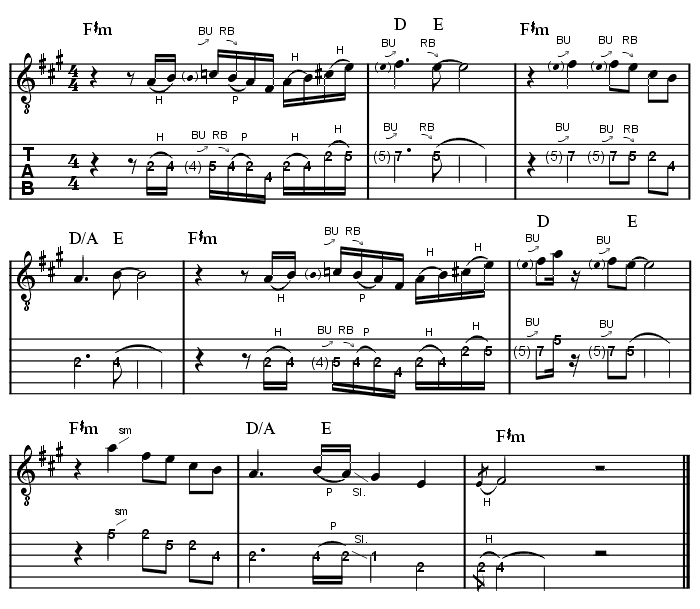Im Rahmen unserer Pentatonik-Gedächtniswochen ist es natürlich ein absolutes Muß, dass auch unsere Serie Lick der Woche, ganz im Zeichen der hippen 5-Ton Skala steht. Diesmal wollen wir uns mit einem Gitarristen beschäftigen, der mit seiner obercoolen Gitarrenarbeit schon seit vielen Jahren für jede Menge Aufsehen in der Szene sorgt. Die Rede ist von Mr. Mark Knopfler, formerly known as Mr. Dire Straits. Mit seinem aktuellen Release, dem Album Sailing To Philadelphia, zeigt der gute Mark einmal mehr, dass er ein begnadeter Songwriter ist, der dazu auch noch mit einem untrüglichen Gespür für die Melodie ausgestattet zu sein scheint. Ein eindrucksvolles Beispiel für diese Gabe liefert der Titel-Song des Albums Sailing To Philadelphia, den er zusammen mit Sangesbruder James Taylor aufs Band gebracht hat. Die recht simple Akkordfolge der Nummer ist geschickt instrumentiert und wird durch den lasziven Sangesstil der beiden Brothers In Arms zu einem echten Kleinod. Die nötigen gitarristischen Akzente setzt der gute Mark durch den Einsatz einiger typischer Knopfler Trademark-Lix. Einmal mehr ist es hierbei Marks Fingerstyle, der seinen Sololix den authentischen Sound besorgt. Um dir die Chance zu geben, einen Einblick in den Spielstil des Gitarreros zu bekommen, habe ich dir eine Art Destillat der Soloarbeit des Songs angesetzt. Die Akkorde basieren auf dem Refrain-Teil des Songs und stehen in der Tonart F#Moll, eine Tatsache die die F# Moll-Pentatonik zur Skala der Wahla werden lässt. Hör dir die Nummer jetzt zunächst einmal an. Alles weitere dann später! Solo im Stil von Sailing To Philadelphia - Audio abspielen