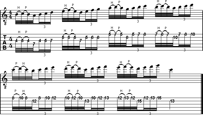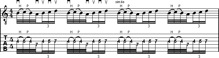 von Hansi Tietgen Sicher kennst du das Übe-Phänomen auch: Phasenweise will einfach nichts gelingen und egal was man auch anfasst, alles endet im Chaos: Inspiration Zero. Frust auf der ganzen Linie ist angesagt. In solchen Phasen der Stagnation genügt oft ein winzig kleiner Tipp und schon läuft alles wieder wie geschmiert. Als dein persönlicher Tipp-Assistent in allen gitarristischen Lebenslagen sehen wir es als unsere ganz spezielle Aufgabe an, dich in unseren Lick-der-Woche-Folgen mit eben diesen kleinen, aber feinen Frusthelferlix zu versorgen. Hier ist einer von ihnen- nur so vorsorglich! Unser heutiger Seelentröster ist rhythmischer Natur und hat schon so manchem eingefahrenen Lick zu neuem Glanz verholfen. Prinzipiell handelt es sich hierbei um eine Art von Triller der auf 32teln basiert und jedem Lauf ein Plus an aufregender Geschwindigkeit mit auf den Weg geben kann. Das Basispattern stellt sich dabei folgendermaßen dar: Basispattern hören