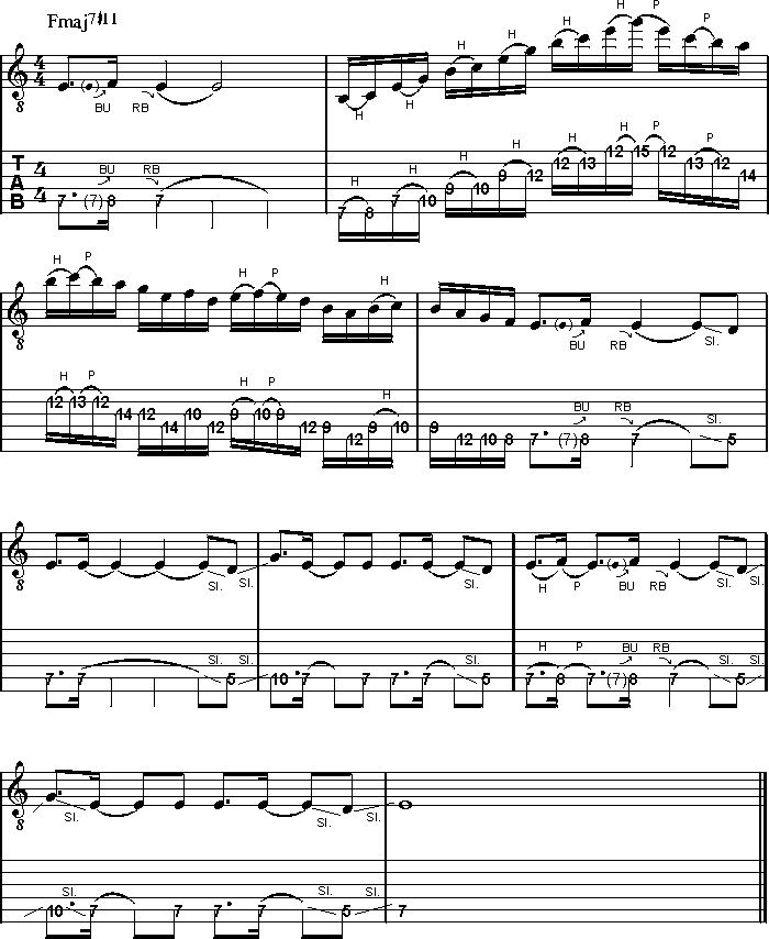 Jetzt aber zur Praxis. Unser aktueller Lick der Woche arbeitet mit den eben vorgestellten lydischen Akkorden und ist ein sehr gutes Beispiel für den coolen Sound des lydischen Modes.