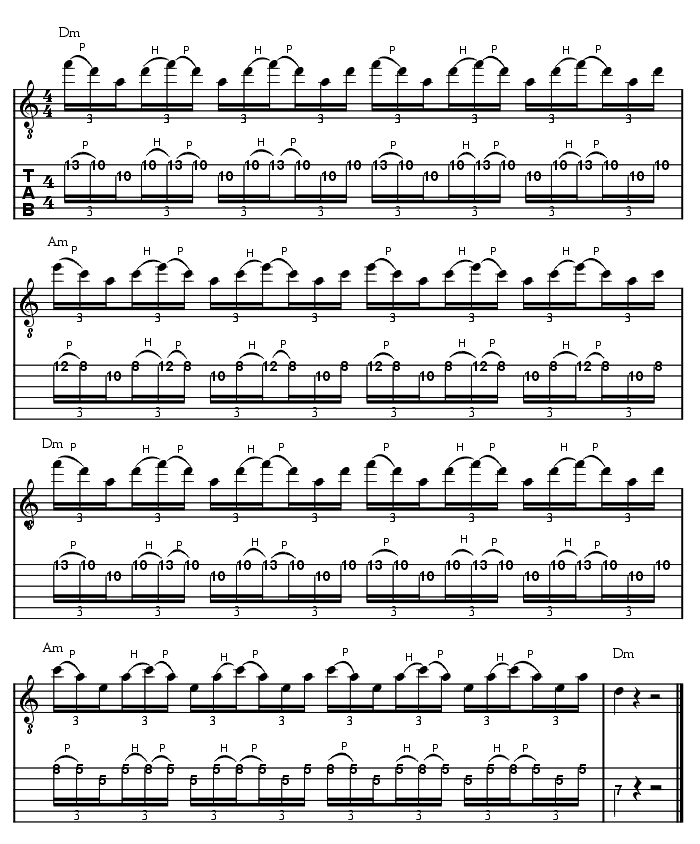 Wie schon gesagt: Der Lick besteht ausschließlich aus Arpeggien. Im Unterschied zu unserem Workshop Beispiel, ist diese Version allerdings komplett in Sechzehntel-Triolen rhythmisiert. Speed ist also angesagt. Als Grundlage des Ganzen dient ein Pattern, das ich auf alle Arpeggien der Studie gleichermaßen angewendet habe. Um dich mit der Spielweise der Übung vertraut zu machen, genügt es also, dir zunächst einmal den ersten Takt des Licks draufzuschaffen. Er liefert dir alle Infos die du benötigst, um die Studie optimal meistern zu können. Wenn dir das Pattern in Fleisch und Blut übergegangen ist, kannst du dich langsam aber sicher an die anderen Takte 'ranmachen. Nutze auch die SLO MO-Version des Tracks. Gerade bei Problemen mit der Phrasierung des Licks kann sie dir sicher weiterhelfen