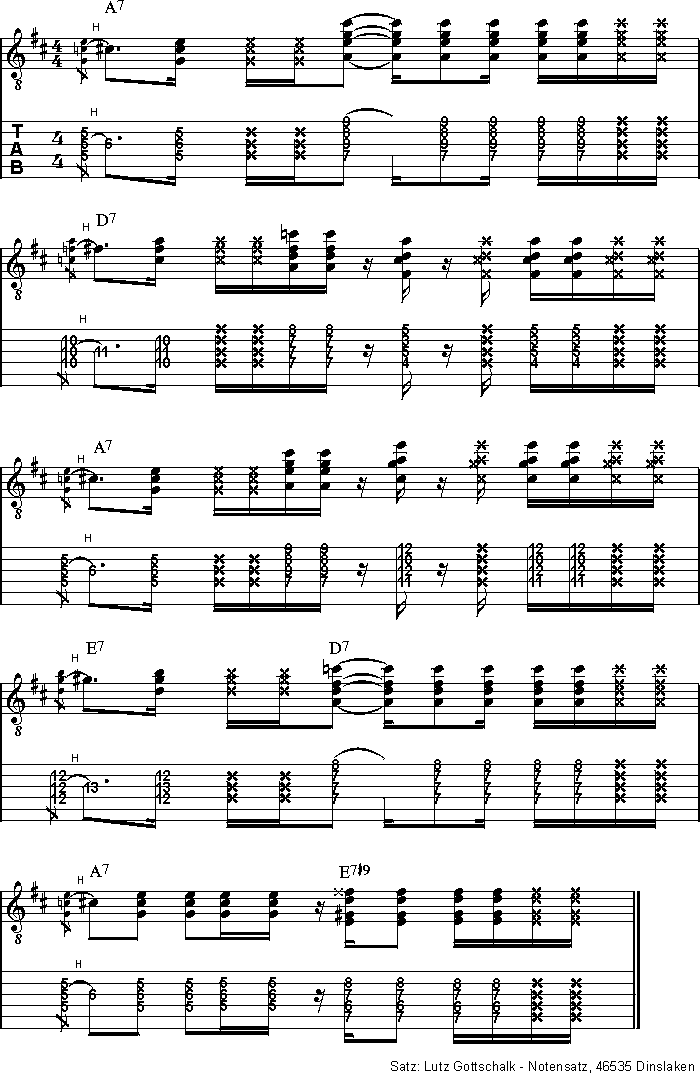 Um die statische Struktur der Blueskadenz ein wenig aufzulockern, bediene ich mich einiger interessanter Trix. Achte besonders darauf, in welcher Form ich die verschiedenen Akkordumkehrungen zum Einsatz bringe. Ich brauche sicher nicht zu erwähnen, dass du - so inspiriert- auch eigene Experimente mit den Chords an den Start bringen sollst. Denn nur der eigenständige Gebrauch der Voicings, bringt dir die Erfahrung die du benötigst, um deine Akkordarbeit - ab sofort- mit dem Akkordumkehrungs-Tool verzieren zu können! Am Anfang ist das zwar nicht ganz leicht, aber du wirst sehen: Es lohnt sich! TIPP: Nimm dir die Studie zunächst einmal taktweise vor. Dabei solltest du das Tempo soweit reduzieren, dass du ohne Stress arbeiten kannst und gewährleistet ist, dass du keine unnötigen Flüchtigkeitsfehler einbaust. Nachdem du dich auf diesem Wege mit den rhythmischen und greiftechnischen Details vertraut gemacht hast, kannst du damit beginnen, dass Spieltempo kontinuierlich zu steigern! Viel Spaß beim Üben Hansi Tietgen
