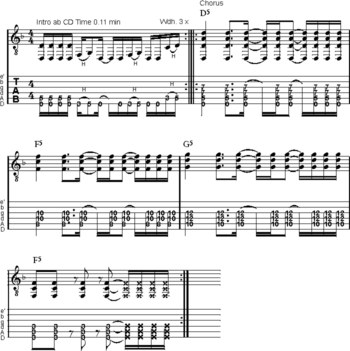 Übrigens: Genau wie schon bei Leader Of Men, habe ich es mir auch bei Breathe vorbehalten, das Arrangement so zu verändern, das du auf relativ kleinem Raum möglichst viel über den Song erfährst!!! Die AnalyseDas Riff basiert auf Tönen der D-Moll Pentatonik. Die Rhythmik hat es in sich, du solltest dir also beim Üben, gerade wenn du noch unerfahrener bist, etwas Zeit geben. Die im Original-Song folgende Strophe überspringen wir in unserer Übungsversion und wenden uns direkt dem powerchordgetriebenen Chorus zu. Er besteht, wie das kleine Wörtchen "powerchordgetrieben" schon vermuten läßt, ausschließlich aus Standard-Powerchords. Schwierig ist wieder die Rhythmik des Parts die ich, der Einfachheit halber, gleichförmig gestaltet habe. Auch diesen Teil haben wir im Flash-Slo Mo Format anzubieten. Bedien dich!