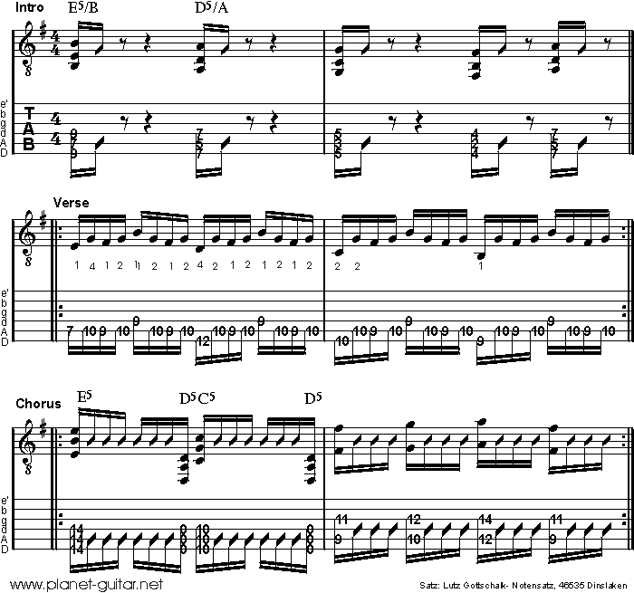 Die AnalyseIm Intro des Songs setzt die Band auf einen ziemlich effektiven Trick, mit dessen Hilfe ganz normale Powerchord-Riffs mit einem interessanten Unterton ausgestattet werden können- Slash Chords. Das Fundament des Parts legt Jerry mit Standard Powerchords, deren jeweiliger Grundton auf der A-Saite zu finden ist. Und genau jetzt kommt "Dicksaiter" Tobin Esperance ins Spiel. Anstatt -wie üblich- die Grundtöne der einzelnen Chords zum Besten zu geben, verlegt Tobin sich darauf, die jeweilige Quinte im Bass zu spielen. Diese Maßnahme, die auch Jerry in seinem Akkordspiel aufgreift- macht den allgemein bekannten Sound der Powerchords, zu einem echten Ereignisse und die normalen Powerbrüder zu den eben schon erwähnten Slash-Chords. Die so entstehende Griffvariante, sieht folgendermaßen aus:
