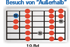 Zurück zum Stück! Bevor wir gleich über das Ending des Solos sprechen werden, wollen wir dir noch eine interessante Variante der D-Dorischen Blues Skala ans Herz legen. Die Skala kommt auf der "4" des sechsten Takts zum Einsatz und featured eine besondere Positionierung der Blue Note. Durch das "Ausleihen" des Tons aus dem benachbarten Fingersatz der Skala, bietet die Variante die Möglichkeit den coolen Sound der Blue Note durch einen einfachen, "hammeringonpulloff-gestützen" Lagenwechsel zu nutzen. In unserem Griffbild haben wir die "auswärtige" Note blau markiert. |