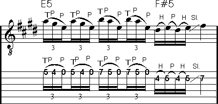 Sum 41- In Too Deep- Der Leadpart Seite 2Die AnalyseFalls du schon einmal das Video zum Song gesehen hast wirst du sicher wissen, dass Gitarrist Dave Baksh an zwei Stellen seines Solos Tappings einsetzt. Ist ja eigentlich auch kein Wunder, schließlich gibt Mr. Brown Sound auf die Frage, welche Alben zu seinen All Time Favourites gehören, unter anderem auch das Van Halen Album Fair Warning an. Namentlich folgender Teil des In Too Deep Solos lässt sich mit Hilfe der Tapping Technik zum Besten geben:
