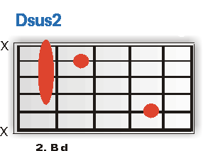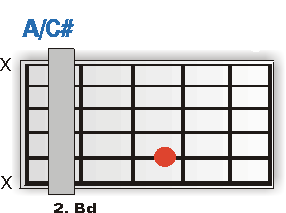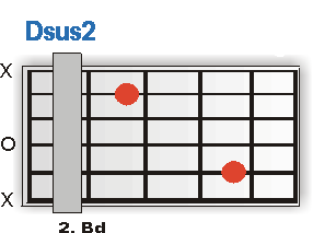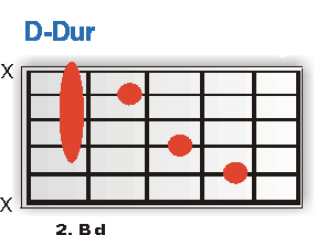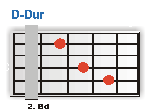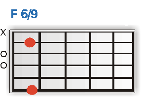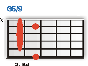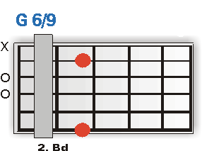 Da der Capodaster im 2. Bund ansetzt, werden alle Akkorde um einen Ganzton nach oben transponiert. So wird zum Beispiel aus einem C ein D, oder einem F6/9 ein G6/9.