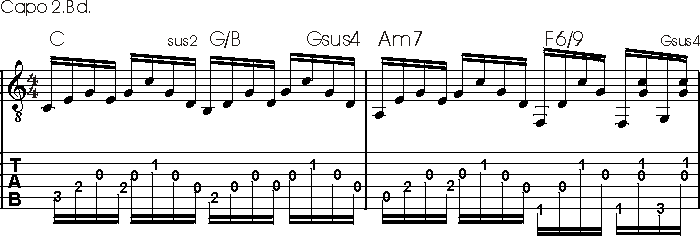 Aber es geht auch anders: Damit du auch ohne Capo-Einsatz zur Original-CD mitspielen kannst, haben wir dir eine zweite Notations-Variante anzubieten. Sie ist greiftechnisch etwas schwerer zu "händeln", entspricht aber in ihrer Performance genau der Original-Aufnahme.
