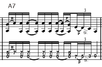 Auch dieses Riff solltest du zunächst einmal separat trainieren. Nur so wirst du in der Lage sein, das komplette Stück fließend "durch zu zocken". Weiter geht es mit einer Variante des in Takt 5 vorgestellten "Open A" Riffs. Nuno beendet den Verse (in Takt 8) mit einem fetten, bluesigen Lauf, inklusive "Open G-String" Einsatz. Durch das ständige Wechseln zwischen der A-, und G-Saite ist auch dieses Sahneteilchen nicht ganz leicht zu meistern. Aber du schaffst das schon. Wir sind uns sicher! |