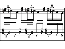 LIWO 53 Extreme Riffing Seite 2Das Verse Riff basiert auf einem A7 Akkord und ist ein repräsentatives Beispiel für Nunos Funk-Faible. Dabei fordert bereits der coole "Open A" Einstieg in Takt 5 den ganzen Gitarristen. Besonders die 16tel Triolen am Ende des Riff haben es in sich und bedürfen einiger Übung. Am besten du trainierst den kompletten Takt zunächst einmal separat. |