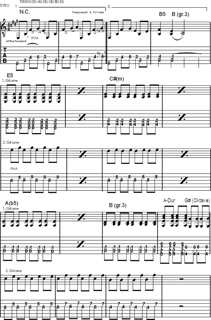 TIPP: Klicke auf das verkleinerte Image und drucke die Noten im sich öffnenden Fenster aus! Chris ist ein sehr versierter Gitarrist. Schon das Intro des Songs verlangt greiftechnisch einiges ab und ist alles andere als sehnenschonend. Das zweitaktige Intro-Riff wird insgesamt dreimal wiederholt und basiert auf einem |