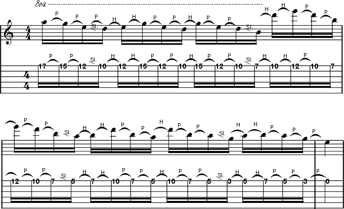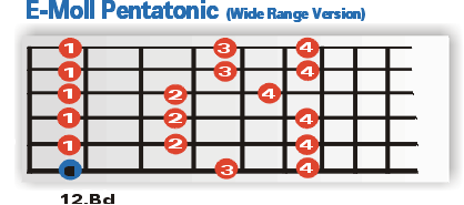 Der Lick besteht ausschließlich aus Tönen der E-Moll Pentatonik. Die im widerange-style angelegten Skalen-Positionen werden mit Hilfe von Slidings miteinander verbunden. und auschließlich mit Hammering On´s und Pull Off´s gespielt. Das macht die Sache nicht unbedingt leichter, klingt aber verdammt gut! Noch nicht überzeugt?! Dann hör´dir doch mal an, wie die Wide Range Pentatonic schneller gespielt rüberkommt: Wide Range Demo hören |