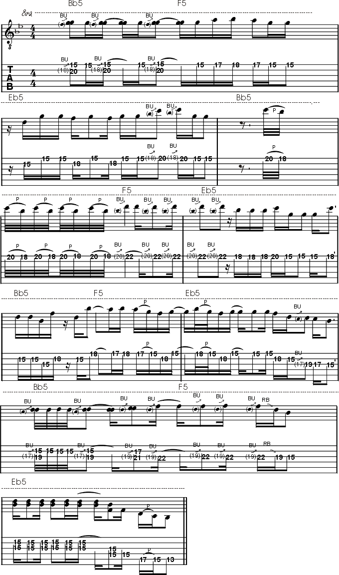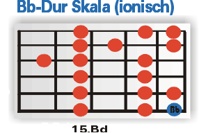 Die drei Powerchords stammen aus der Tonart Bb-Dur. Und genau diese bildet auch die Basis des Solos. Hier die "Main-Scale" im Detail: |