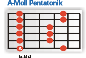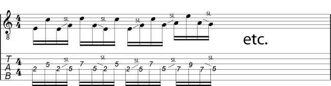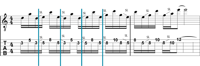 Die Basis des Licks bildet ein insgesamt drei Töne umfassendes Grundpattern, das in jeweils einer Lage der A-Moll Pentatonik abläuft. Die Verbindung der einzelnen Lagen erfolgt dann durch entsprechende Slidings: |