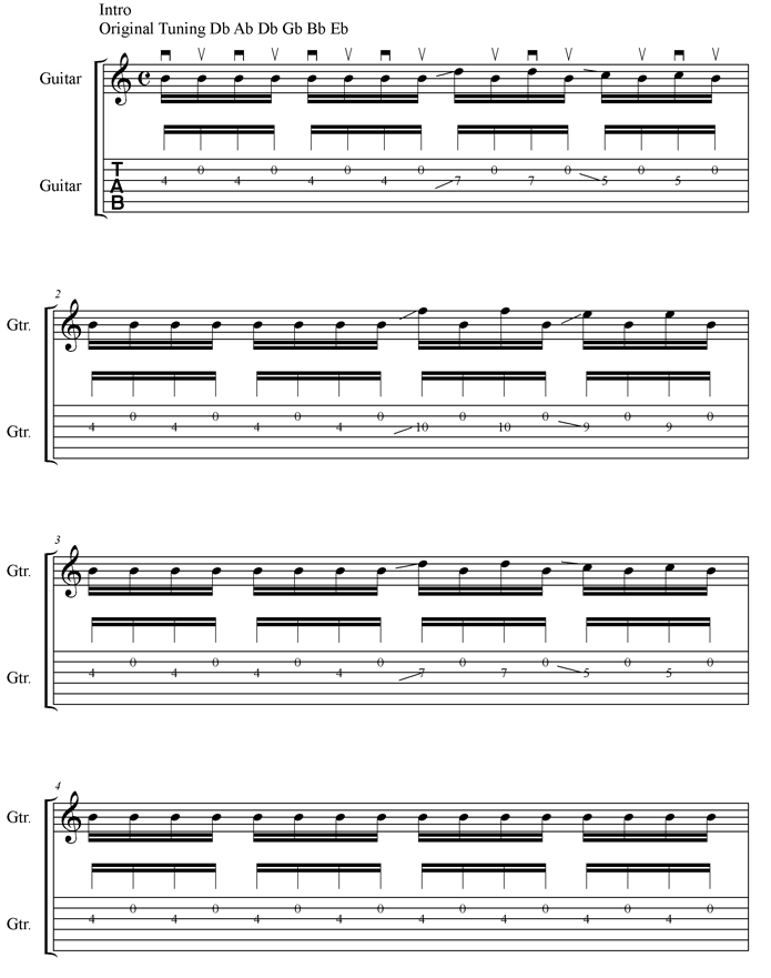 Der coole Sound des Intros basiert auf der Kombination der offenen B-Saite mit einer auf der G-Saite gespielten Melodie-Linie. Die verwendeten Töne stammen allesamt aus der normalen C-Dur Skala. Durch die Kombination mit der offenen B-String, ergibt sich allerdings ein B-lokrischer Sound, mit seinem typischen, leicht "schrägen" Flair.