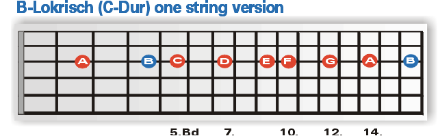 Damit du auch eigene Experimente mit der Skalen/Open-String Kombination machen kannst, haben wir die komplette B-Lokrische Scale (C-Dur) im "One String Format" notiert. Bedien dich! |