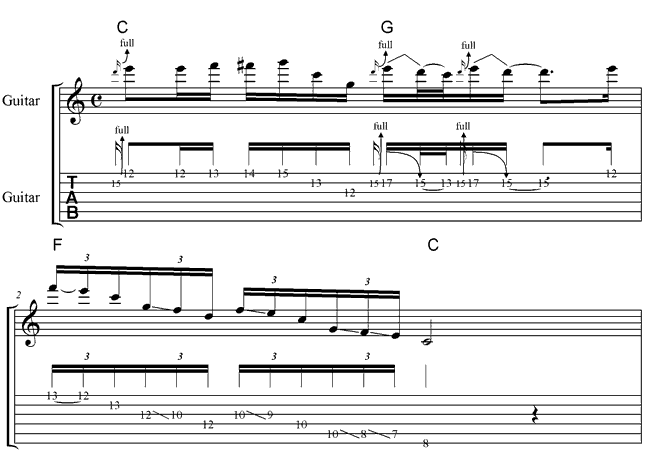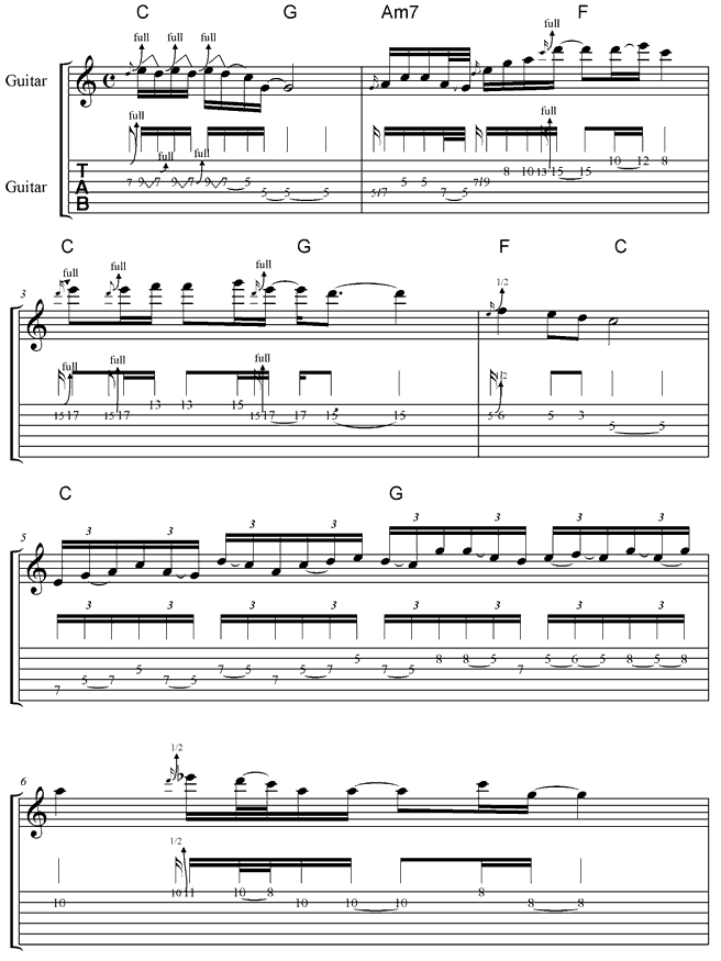 Die Akkordfolge des Song arbeitet mit den Akkorden der I., IV., V. und VI. Stufe der C-Dur Tonleiter. In meinem Solo verwendet ich dementsprechend die C-Dur Tonleiter in Verbindung mit der C-Dur Pentatonik (C-Dur und A-Moll Pentatonik sind identisch).