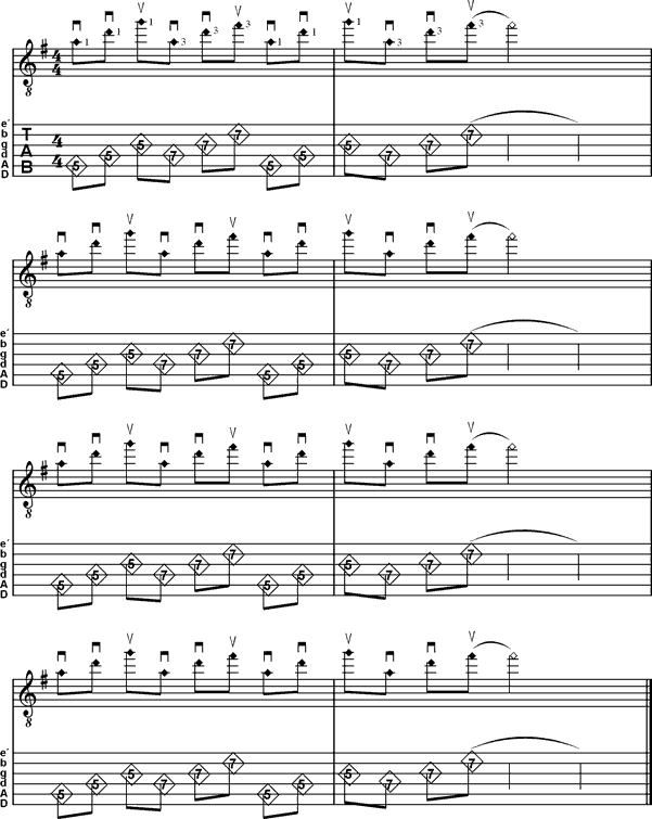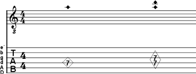 In Notationen werden Flageolett-Töne durch rautenförmige Notenköpfe symbolisiert. In der Tabulatur umschließt eine Raute die entsprechende Zahl (Bundangabe). Kommen mehrere Flageoletts in Folge zum Einsatz, bleibt die Schreibweise in der Notenzeile gleich. Auch in diesem Fall werden die Notenköpfe rautenförmig dargestellt. In der Tab gibt es beim massivem Auftreten von "Flags" zwei amtlich anerkannte Schreibweisen. In der ersten wird das Auftauchen von Flageoletts durch den Zusatz "harm" gekennzeichnet. Dabei gibt eine gestrichelte Linie an, welche Töne im Flageolett-Stil gespielt werden. Schreibweise Numero 2 setzt auch bei mehreren "Harmonics" in Reihe auf den Einsatz von "Rauten". Und genau für diese optisch eindeutigere Schreibweise haben wir uns entschieden!